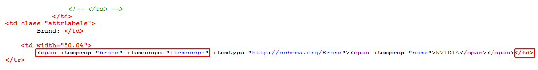 Now we need to select "Brand: NVIDIA" and look at the html-code of the selection. As you can see, eBay uses itemprop