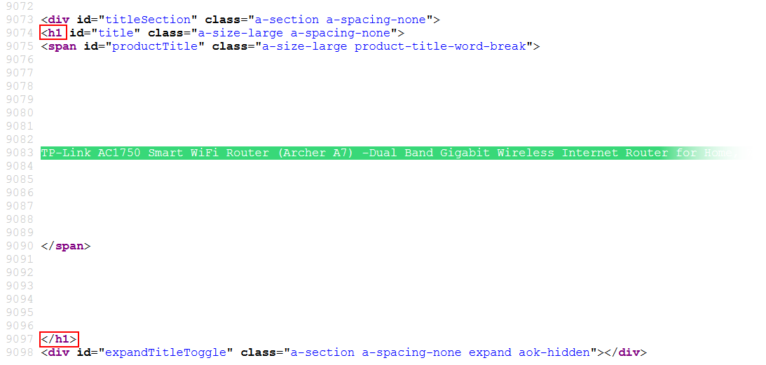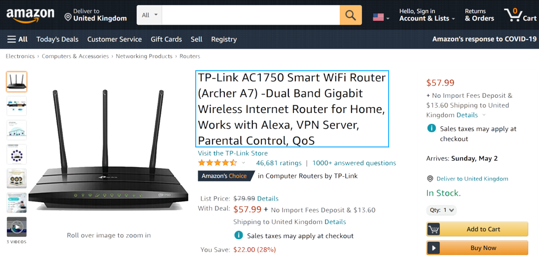 Let's start with NAME (product name). In the browser, we can see that the product is called "TP-Link AC1750 Smart WiFi Router (Archer A7) -Dual Band Gigabit Wireless Internet Router for Home, Works with Alexa, VPN Server, Parental Control, QoS".